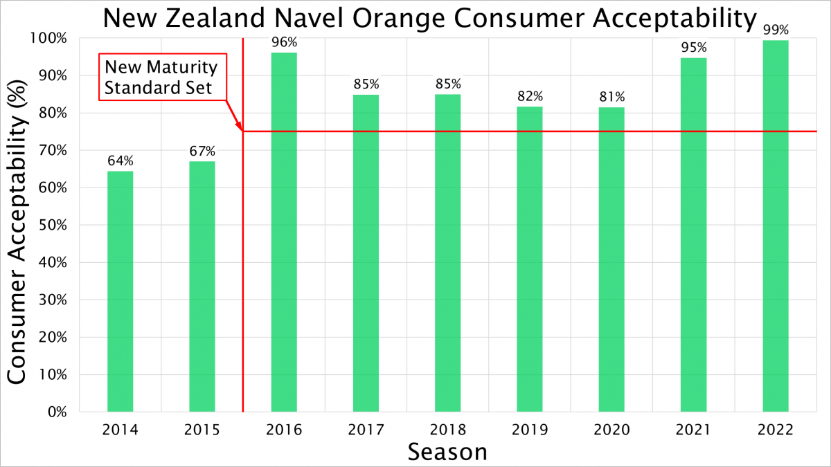 Retail monitoring data has shown a consistently high consumer acceptance for New Zealand navel oranges since 2016 when the industry adopted minimum maturity standards and independent clearance processes that were designed by crop quality specialists, Delytics Ltd.